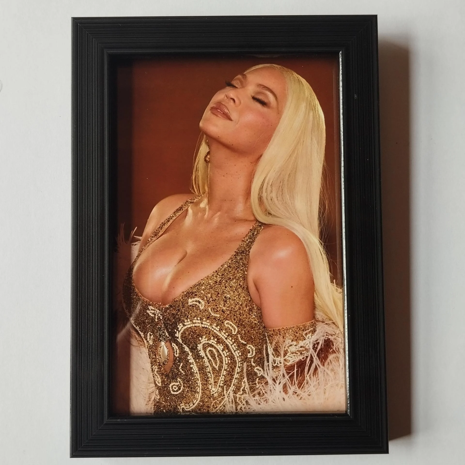 Description : Photo BEYONCE avec cadre qui dispose d'un système d'accroche murale ou d'un pied qui permet de décorer votre table ou étagère.
