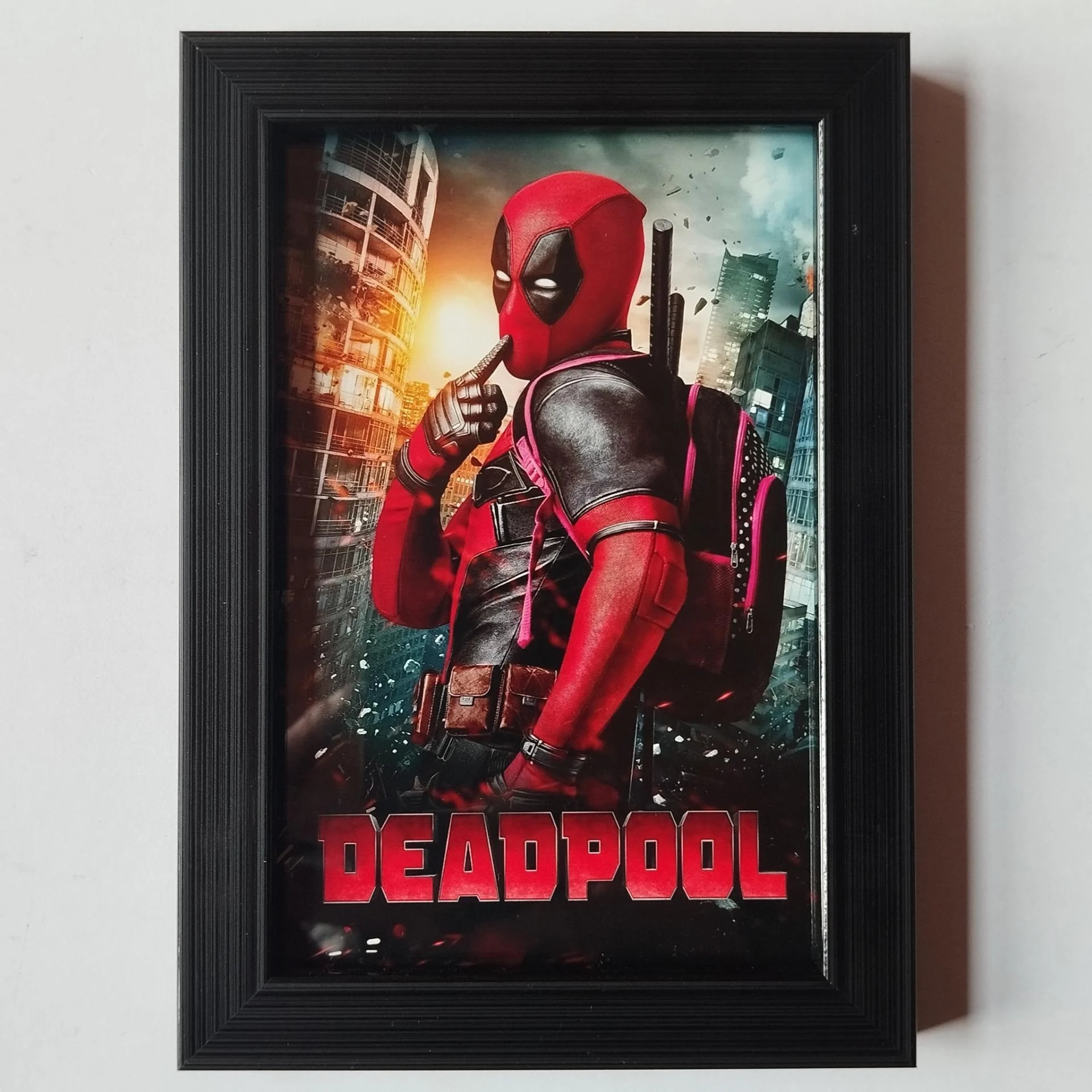 Description : Photo DEADPOOL avec cadre qui dispose d'un système d'accroche murale ou d'un pied qui permet de décorer votre table ou étagère.