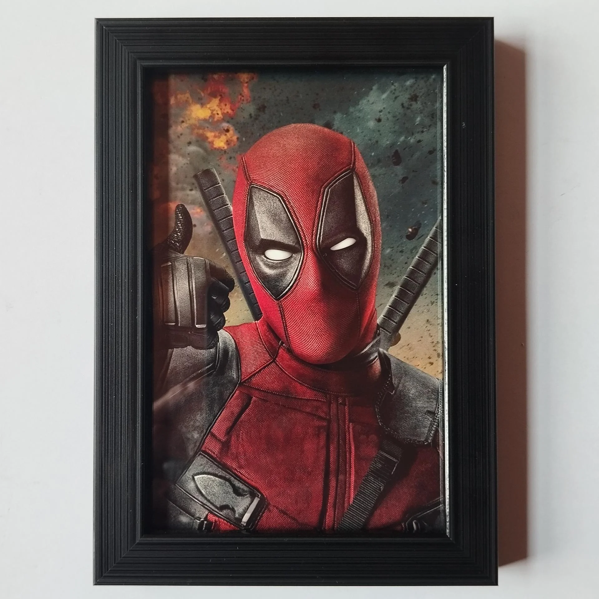 Description : Photo DEADPOOL avec cadre qui dispose d'un système d'accroche murale ou d'un pied qui permet de décorer votre table ou étagère.