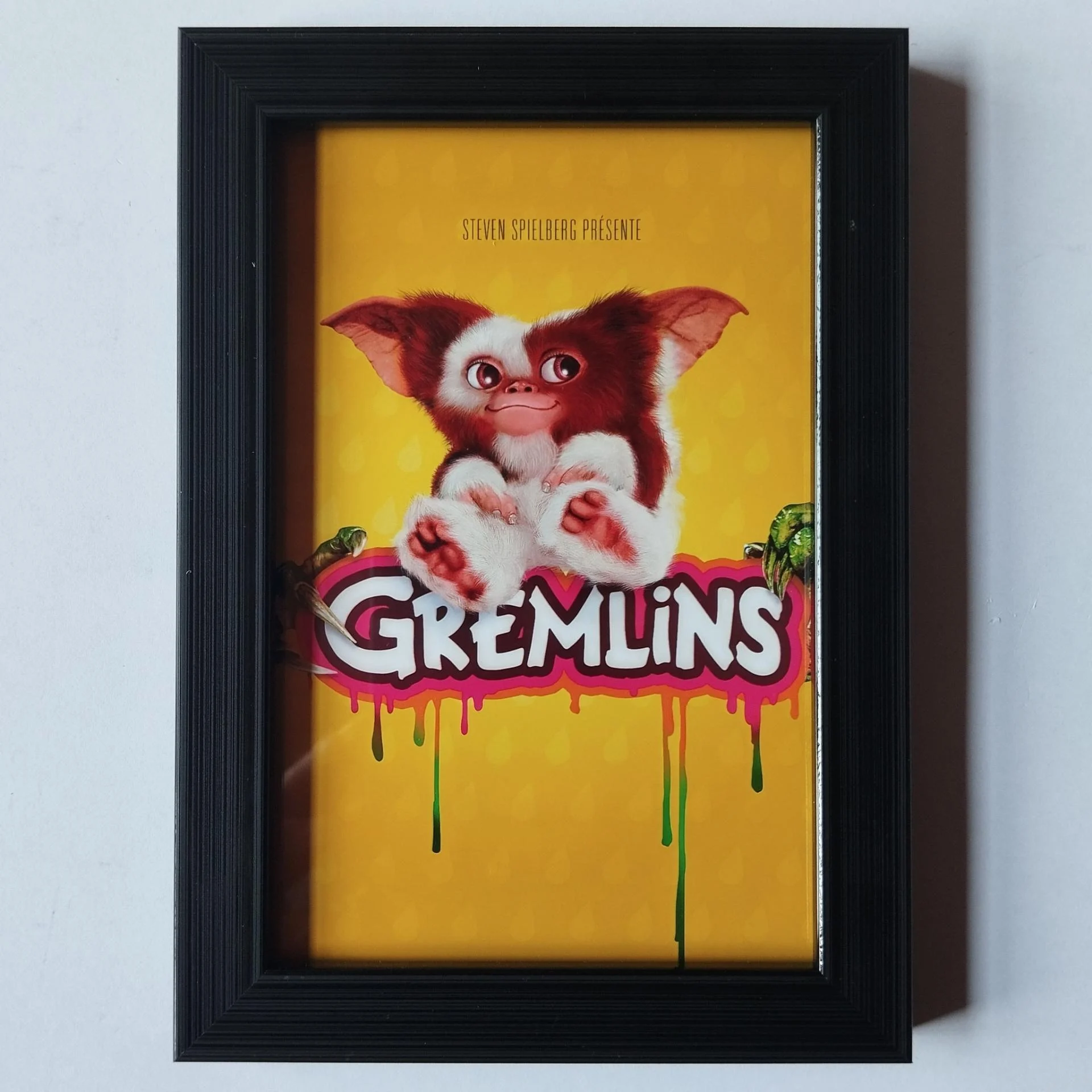Description : Photo GREMLINS avec cadre qui dispose d'un système d'accroche murale ou d'un pied qui permet de décorer votre table ou étagère.