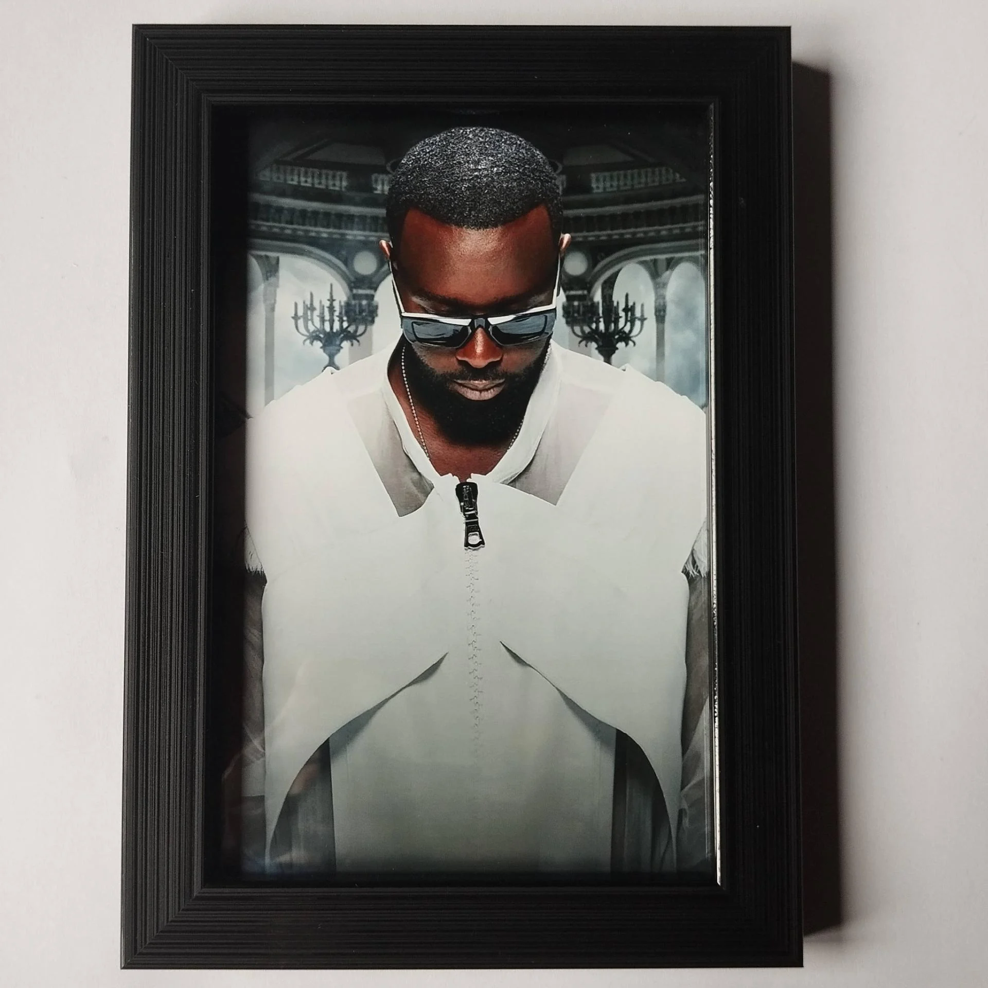 Description : Photo MAITRE GIMS avec cadre qui dispose d'un système d'accroche murale ou d'un pied qui permet de décorer votre table ou étagère.