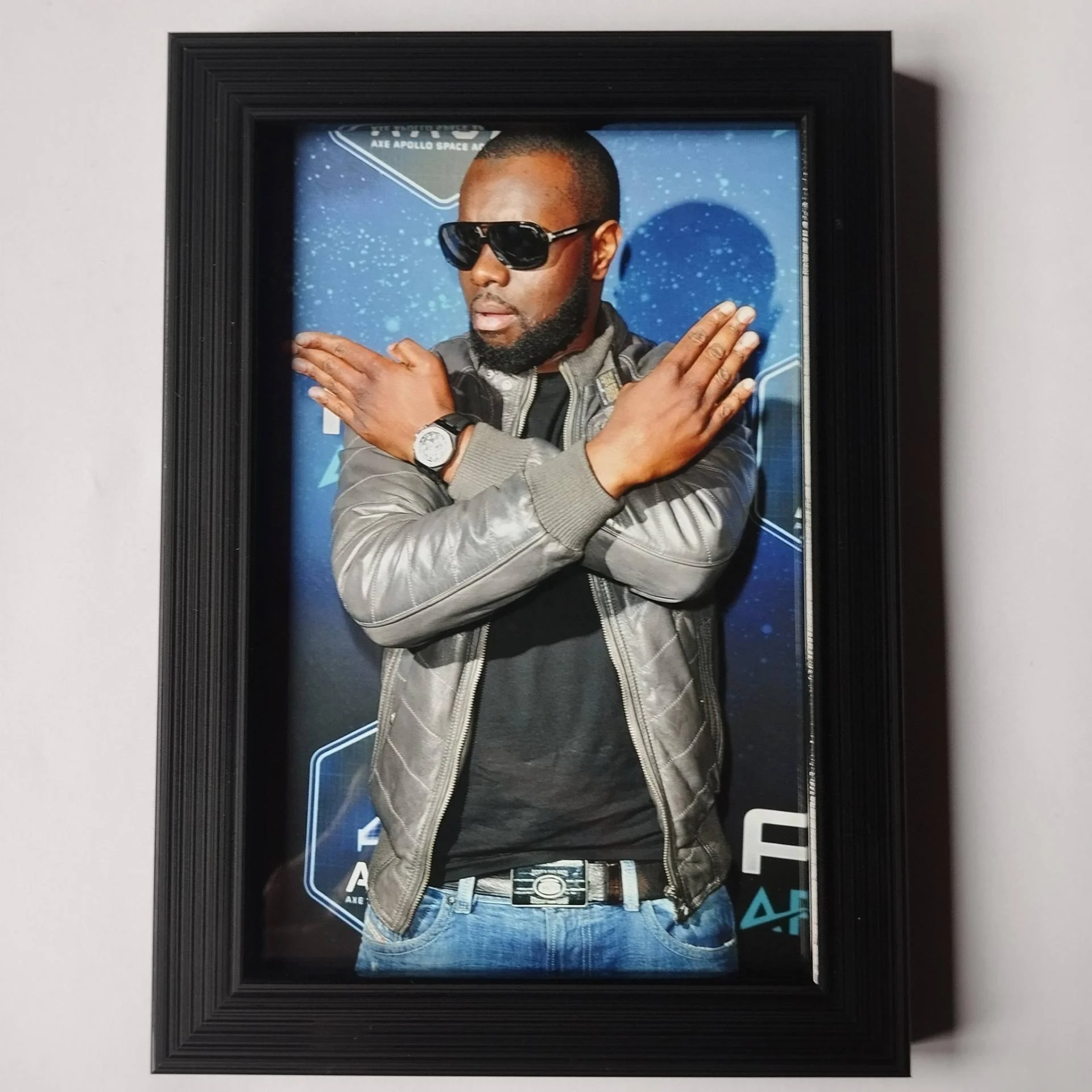 Description : Photo MAITRE GIMS avec cadre qui dispose d'un système d'accroche murale ou d'un pied qui permet de décorer votre table ou étagère.