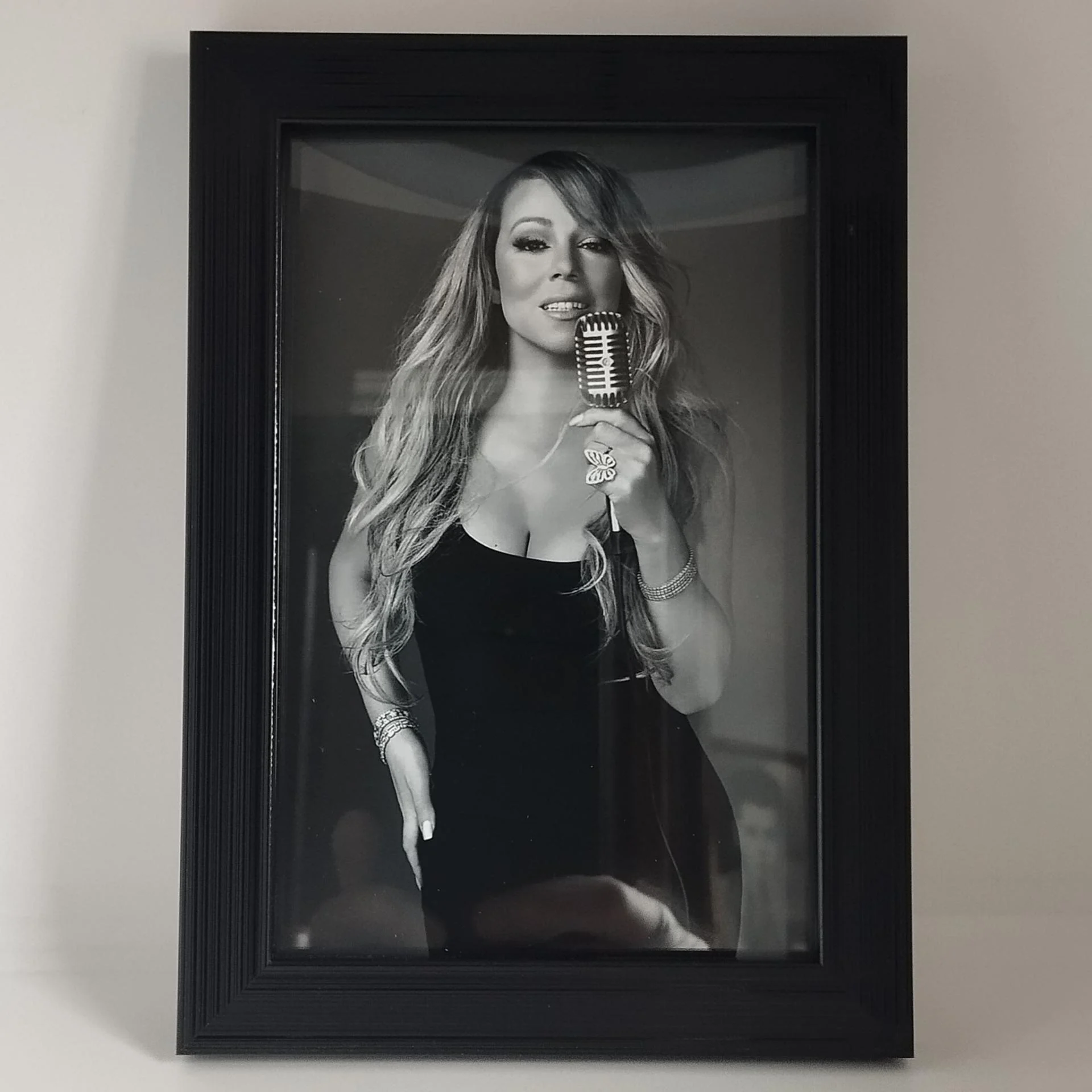 Description : Photo MARIAH CAREY avec cadre qui dispose d'un système d'accroche murale ou d'un pied qui permet de décorer votre table ou étagère.
