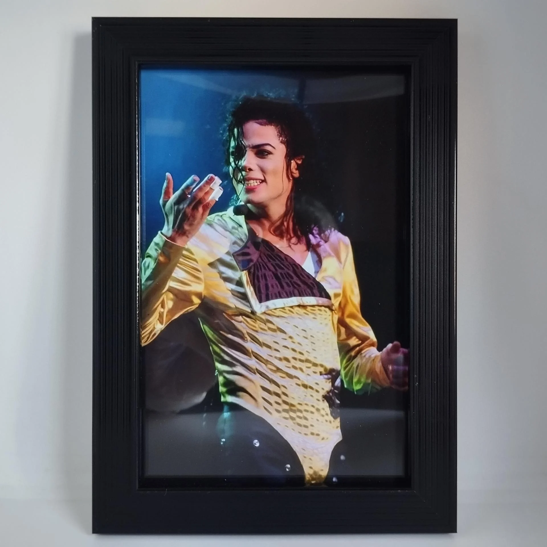 Description : Photo MICHAEL JACKSON avec cadre qui dispose d'un système d'accroche murale ou d'un pied qui permet de décorer votre table ou étagère.