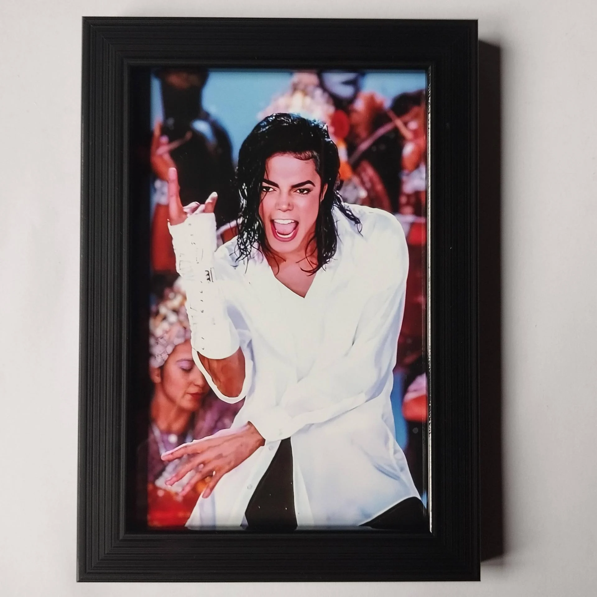 Description : Photo MICHAEL JACKSON avec cadre qui dispose d'un système d'accroche murale ou d'un pied qui permet de décorer votre table ou étagère.