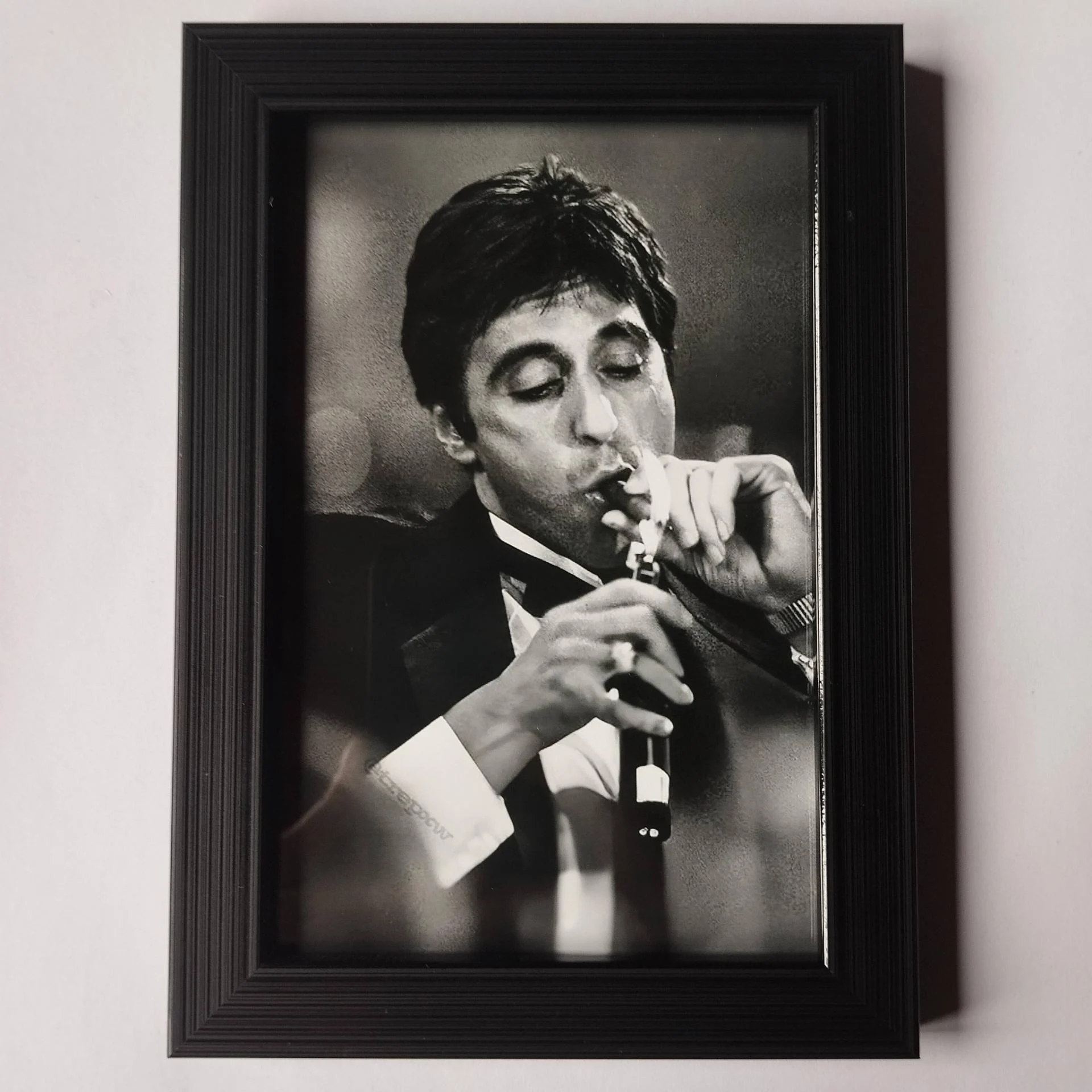 Description : Photo SCARFACE avec cadre qui dispose d'un système d'accroche murale ou d'un pied qui permet de décorer votre table ou étagère.