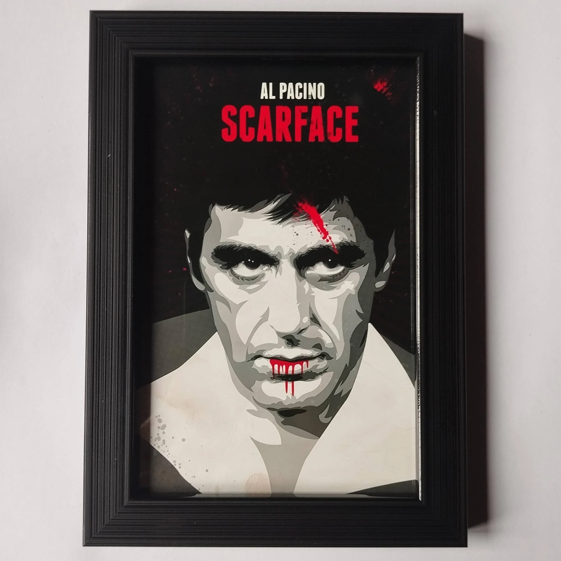 Description : Photo SCARFACE avec cadre qui dispose d'un système d'accroche murale ou d'un pied qui permet de décorer votre table ou étagère.