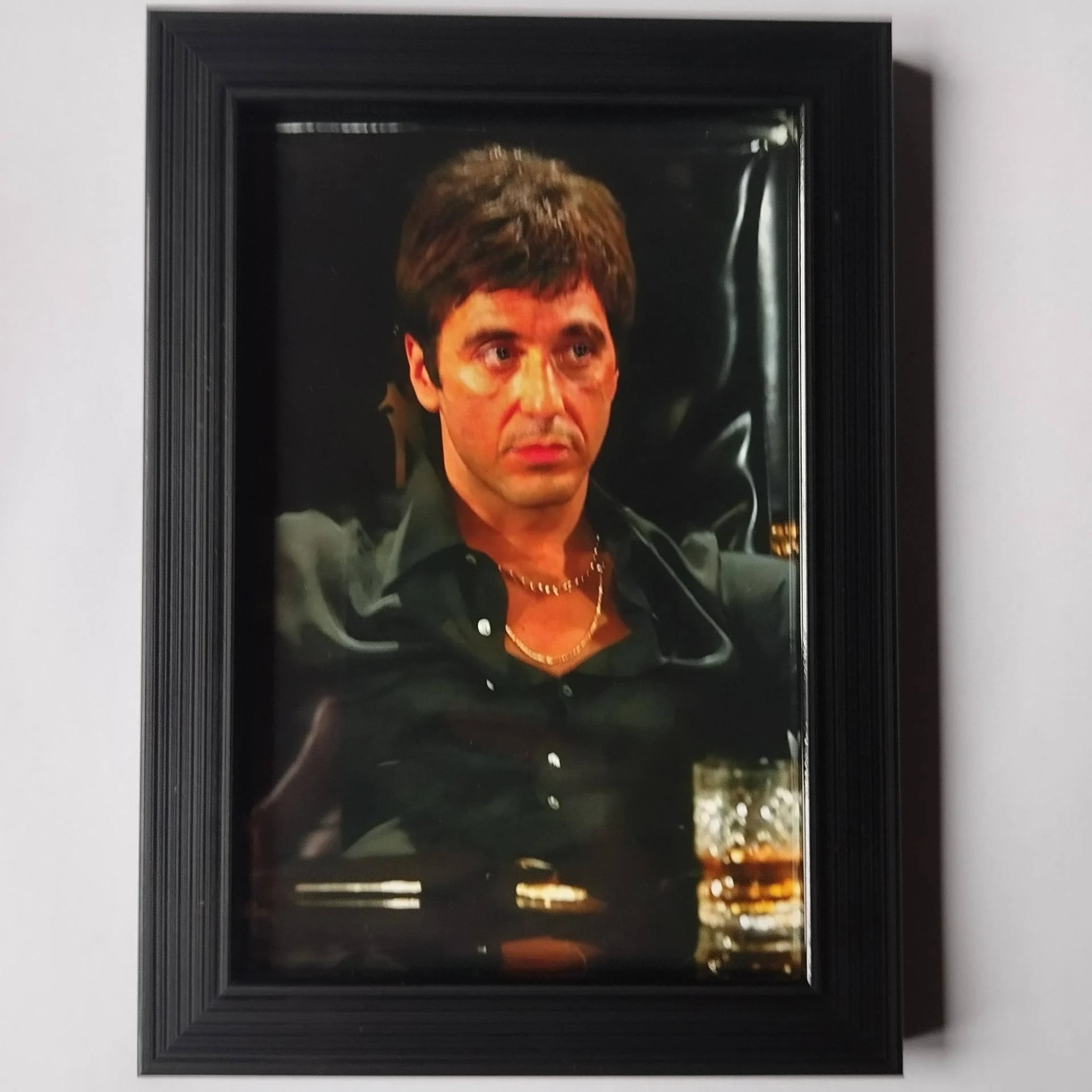 Description : Photo SCARFACE avec cadre qui dispose d'un système d'accroche murale ou d'un pied qui permet de décorer votre table ou étagère.