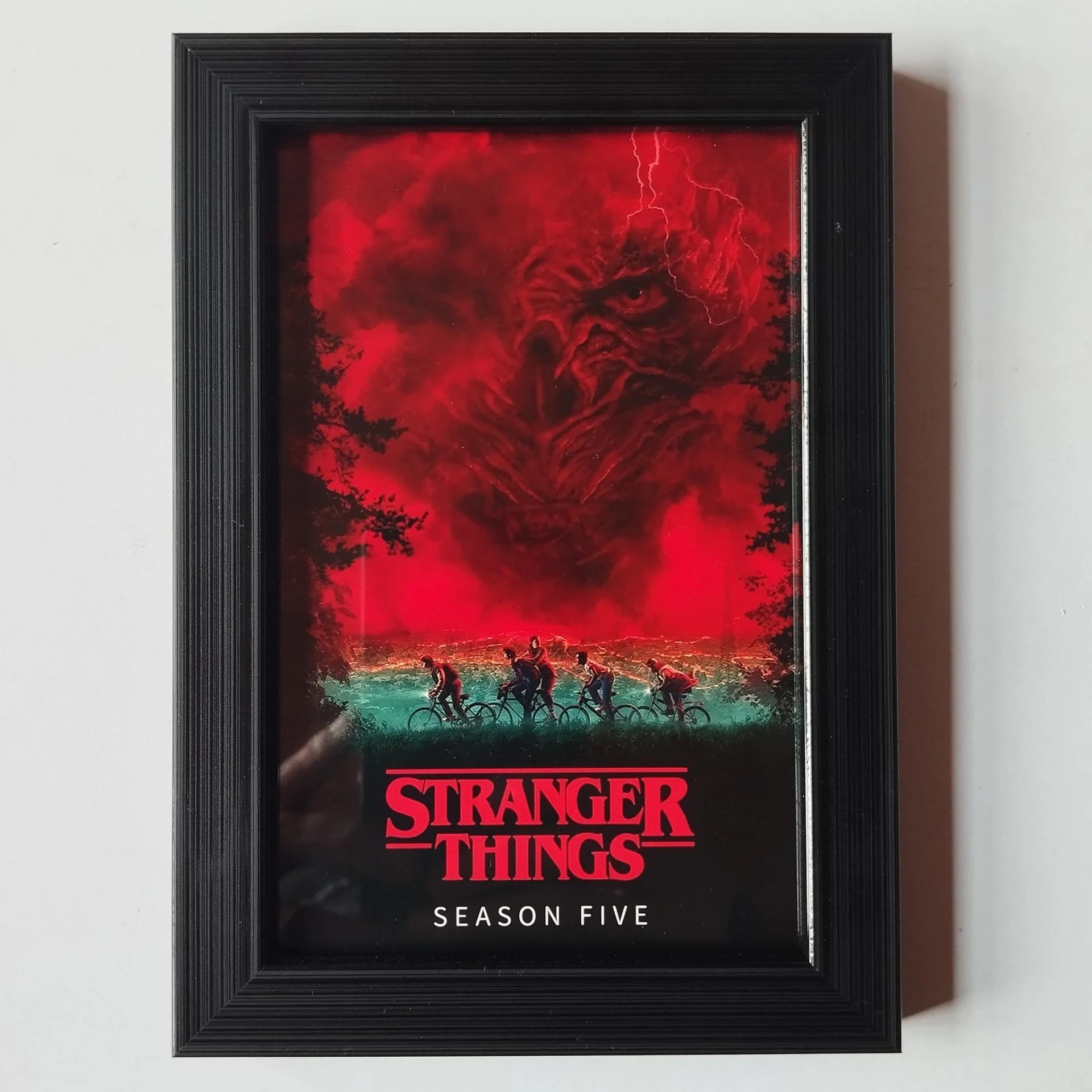 Description : Photo STRANGER THINGS avec cadre qui dispose d'un système d'accroche murale ou d'un pied qui permet de décorer votre table ou étagère.