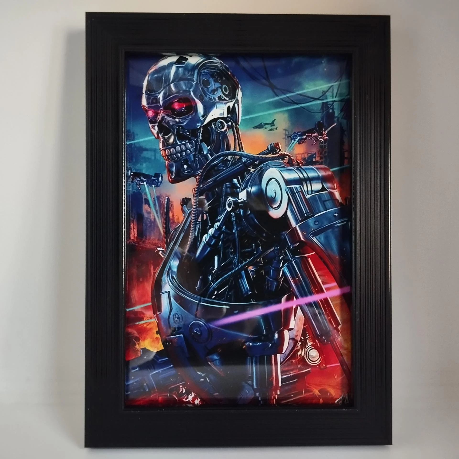 Description : Photo TERMINATOR avec cadre qui dispose d'un système d'accroche murale ou d'un pied qui permet de décorer votre table ou étagère.